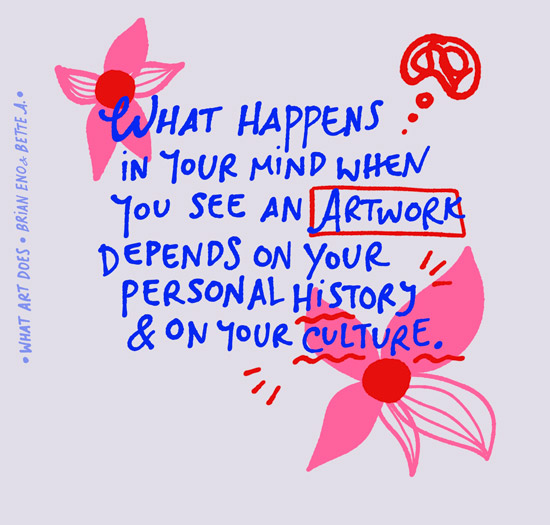 In the book, Brian and Bette talk about many reasons why art is out there and has been forever. Even though its use is not immediately utilitarian, it’s still quite essential for our everyday being. Eno argues that since art “can have a tremendous effect on the world”, it is considered as one of the means to navigate people in a particular direction by many notorious world dictators (speaking propaganda, or locking artists away).